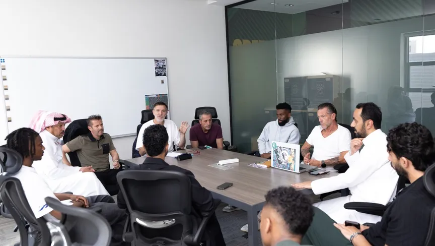مساعدو هيرفي رينارد مدرب السعودية خلال الاجتماع مع بعض لاعبي الهلال - 11 فبراير 2026 - www.saff.com.sa