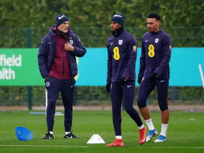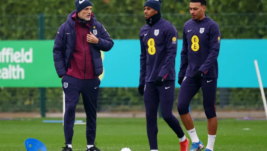 توماس توخيل مدرب إنجلترا (إلى اليسار) مع ماركوس راشفورد ومورجان روجرز لاعبي إنجلترا - 23 مارس 2025 - Reuters