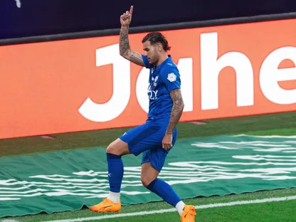 احتفال ثيو هيرنانديز مدافع الهلال بتسجيل هدف في مرمى الأخدود في الدوري السعودي - 25 سبتمبر 2025 - X/@Alhilal_FC