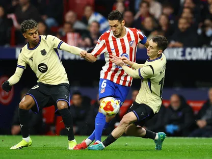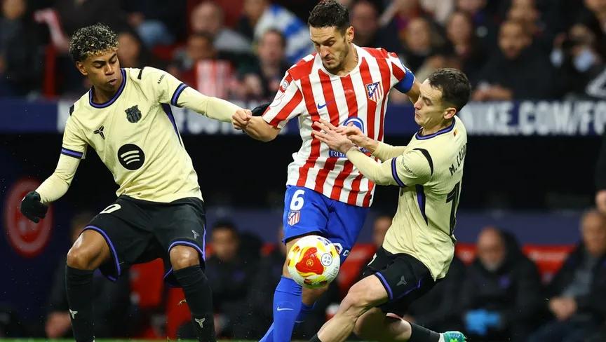 كوكي قائد أتلتيكو مدريد في مواجهة ثنائي برشلونة لامين يامال ومارك كاسادو في كأس ملك إسبانيا - 12 فبراير 2026 - Reuters