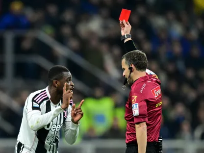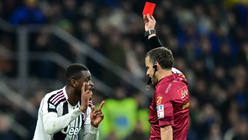 الحكم فيديريكو لا بينا يُشهر البطاقة الحمراء في وجه بيير كالولو خلال مباراة إنتر ويوفنتوس بالدوري الإيطالي - 14 فبراير 2026 - Reuters