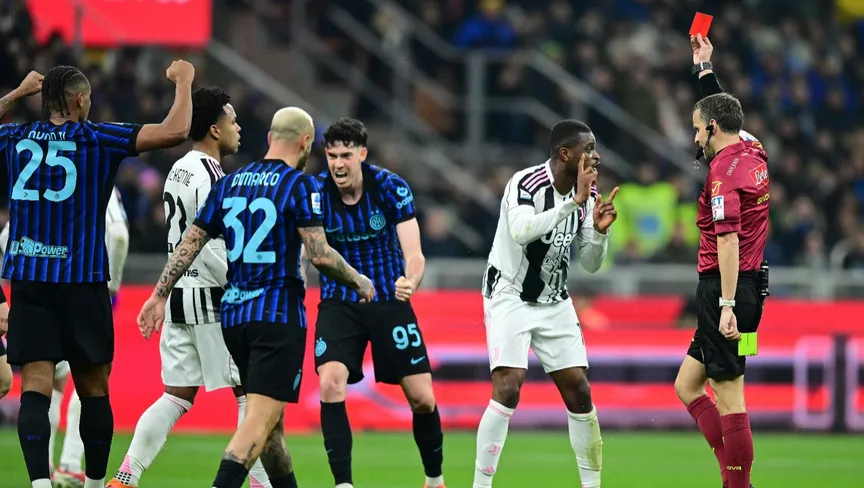 إشهار الحكم فيديريكو لا بينا البطاقة الحمراء للاعب يوفنتوس بيير كالولو بمباراة إنتر في الدوري الإيطالي - 14 فبراير 2026 - Reuters