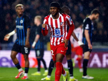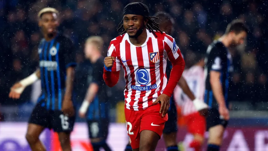 احتفال إديمولا لوكمان لاعب أتلتيكو مدريد بتسجيل هدف في مرمى كلوب بروج بدوري أبطال أوروبا - 18 فبراير 2026 - X/@AtletiArab