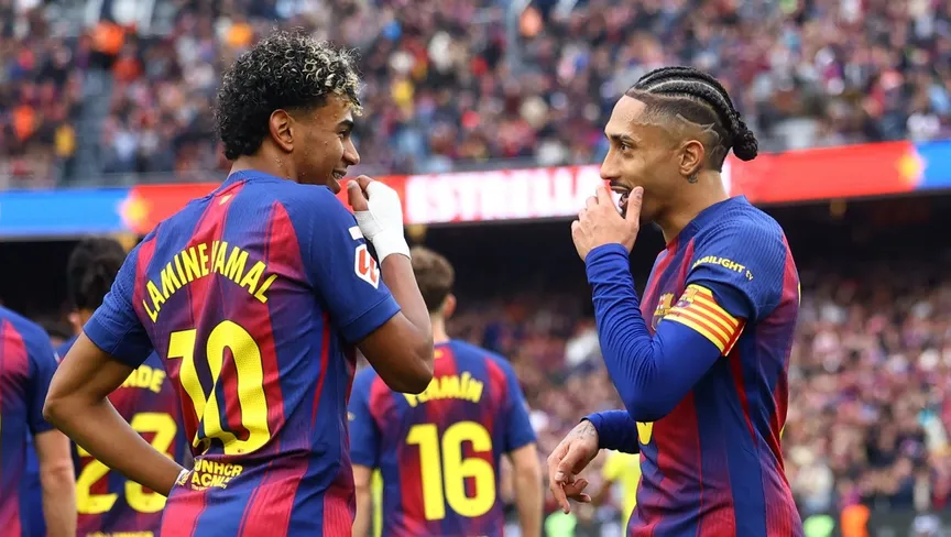 لاعب برشلونة لامين يامال يحتفل بالتسجيل ضد فياريال في الدوري الإسباني مع رافينيا  -  28 فبراير 2026 - Reuters