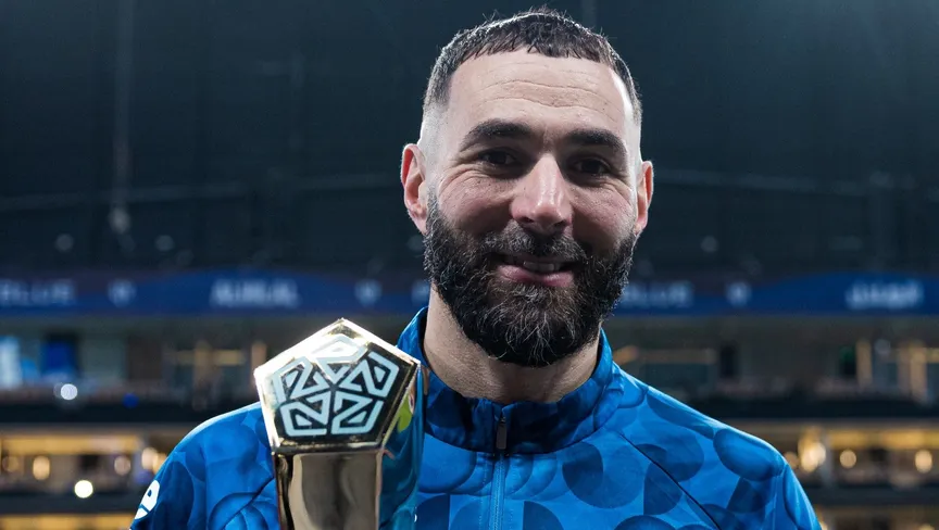 كريم بنزيما نجم الهلال يحمل جائزة أفضل لاعب في مباراة النجمة بالدوري السعودي - 6 مارس 2026 - X/@Alhilal_FC