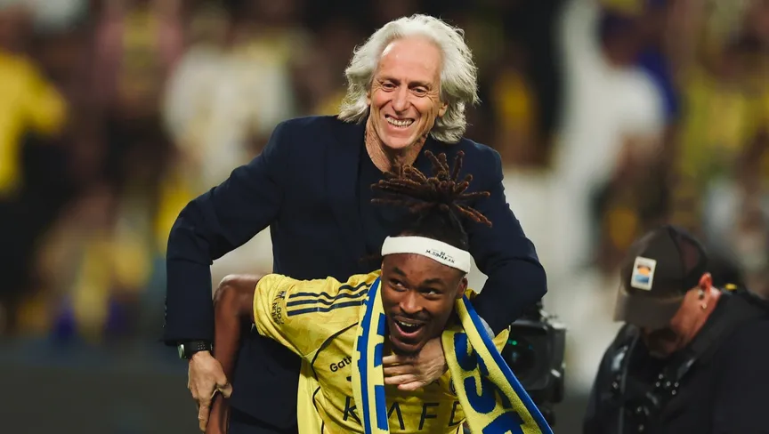 مدرب النصر جورجي جيسوس يمازح محمد سيماكان بعد تسجيله هدف الفوز للنصر في مرمى نيوم بالدوري السعودي - 7 مارس 2026 - X/@AlNassrFC