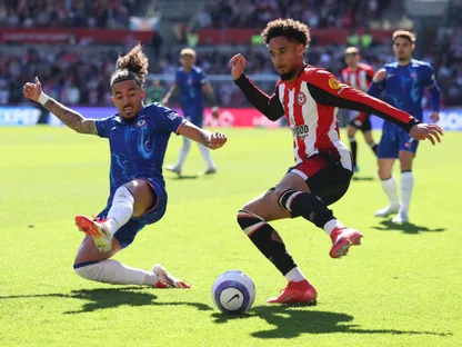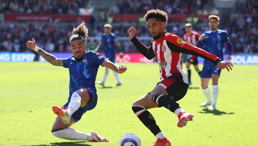 مالو غوستو لاعب تشيلسي يحاول استخلاص الكرة من كيفين شادي لاعب برينتفورد - 6 إبريل 2025 - REUTERS