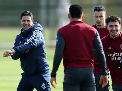 ميكيل أرتيتا مدرب أرسنال في حصة تدريبية مع لاعبيه قبل مواجهة باير ليفركوزن في ذهاب ثمن نهائي دوري أبطال أوروبا - 10 مارس 2026 - Reuters