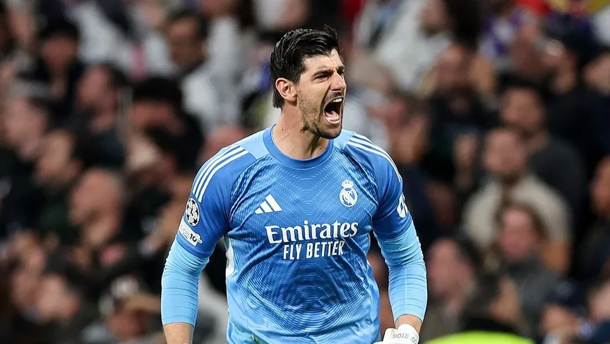 تيبو كورتوا يحتفل بتمريرته الحاسمة لفيديريكو فالفيردي في مباراة ريال مدريد ومانشستر سيتي بدوري أبطال أوروبا - 11 مارس 2026 - X/realmadrid