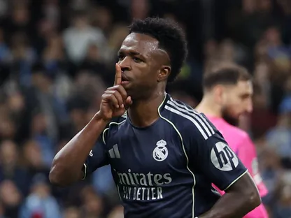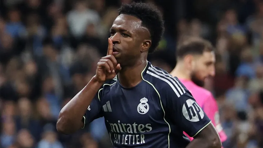 فينيسيوس جونيور يحتفل بعد تسجيله هدفاً لريال مدريد في شباك مانشستر سيتي بدوري أبطال أوروبا - 17 مارس 2026 - REUTERS