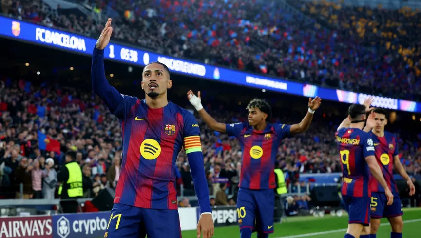 رافينيا لاعب برشلونة يحتفل بهدفه الأول في مرمى نيوكاسل في دوري أبطال أوروبا - 18 مارس 2026 - Reuters