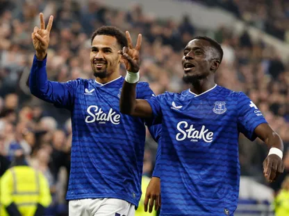 إيليمان ندياي وإدريسا غاي ثنائي إيفرتون خلال الاحتفال بالتسجيل ضد تشيلسي - 21 مارس 2026 - Reuters