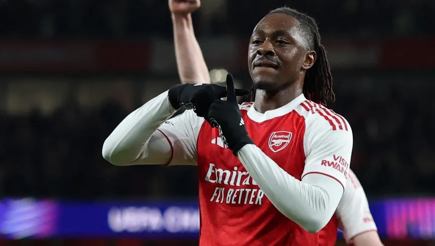 لاعب أرسنال إيبيريتشي إيزي يحتفل بالتسجيل ضد باير ليفركوزن في دوري أبطال أوروبا - 17 مارس 2026 - Reuters