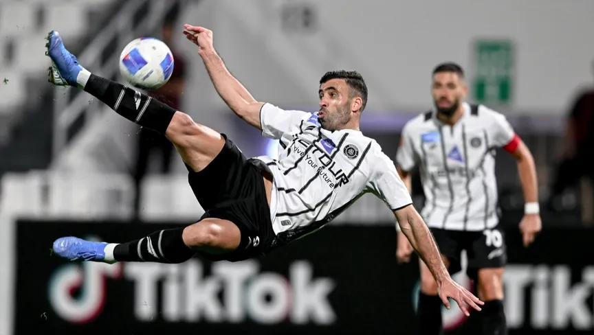 عبد الرزاق حمدالله لحظة تسجيل هدف للشباب في مرمى حضر موت اليمني في دوري أبطال الخليج - 17 فبراير 2026 - X/@AlShababSaudiFC