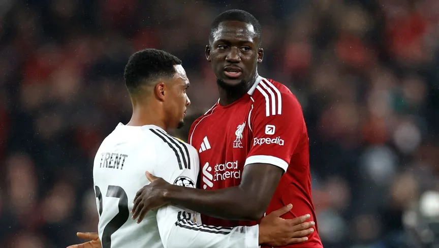 إبراهيما كوناتي مدافع ليفربول يصافح زميله السابق ترينت ألكسندر أرنولد ظهير ريال مدريد خلال مواجهتهما بدوري أبطال أوروبا - 5 نوفمبر 2025 - Reuters