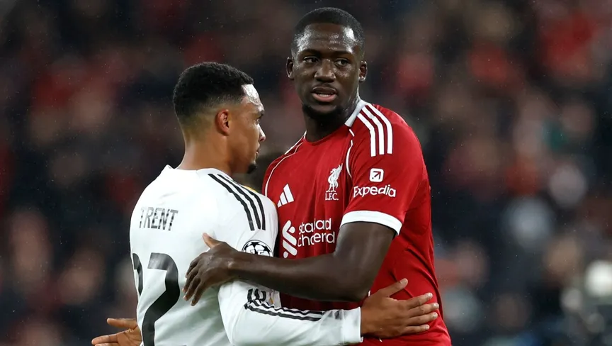 إبراهيما كوناتي مدافع ليفربول يصافح زميله السابق ترينت ألكسندر أرنولد ظهير ريال مدريد خلال مواجهتهما بدوري أبطال أوروبا - 5 نوفمبر 2025 - Reuters