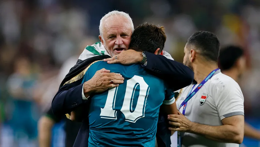 مدرب العراق غراهام أرنولد يحتفل مع مهند علي بعد الفوز على بوليفيا والتأهل لكأس العالم - 31 مارس 2026 - REUTERS