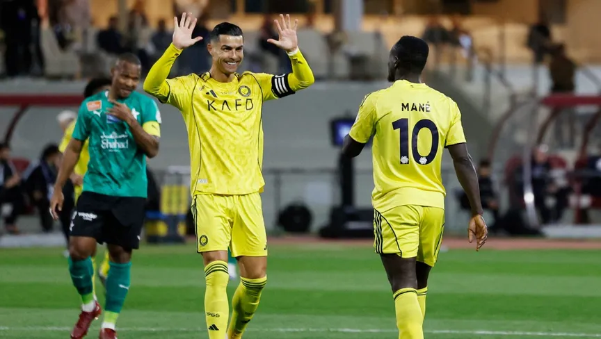 احتفال كريستيانو رونالدو نجم النصر مع زميله ساديو ماني بتسجيل هدف في مرمى النجمة بالدوري السعودي - 25 فبراير 2026 - Reuters