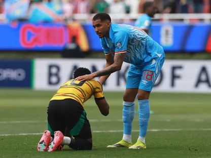 شارل بيكل يواسي رينالدو سيفاس بعد فوز جمهورية الكونغو الديمقراطية على جامايكا في نهائي الملحق العالمي وتأهلها لكأس العالم - 31 مارس 2026 - REUTERS