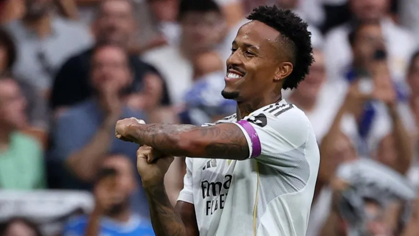 إيدر ميليتاو مدافع ريال مدريد يحتفل بهدفه في مرمى إسبانيول بالدوري الإسباني - 20 سبتمبر 2025 - Reuters