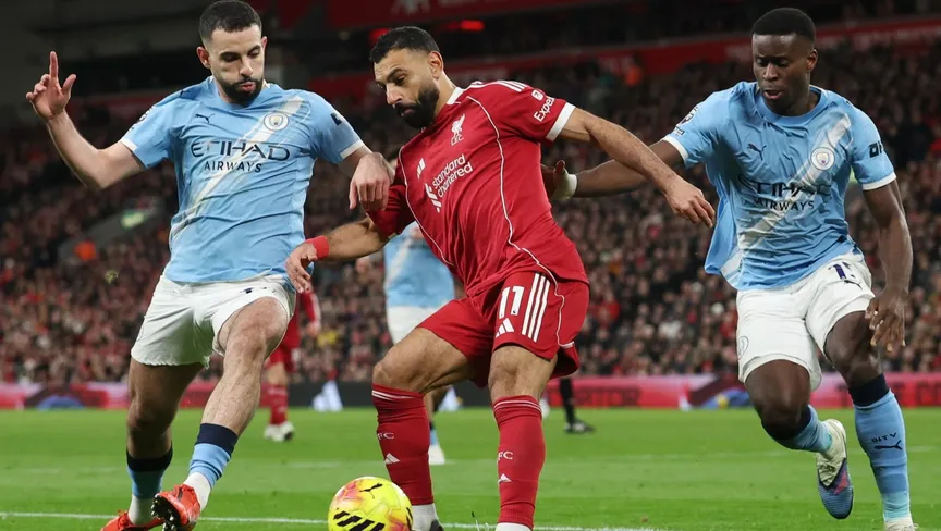 محمد صلاح وريان آيت نوري خلال مباراة ليفربول ومانشستر سيتي بالدوري الإنجليزي الممتاز - 8 فبراير 2026 - Reuters