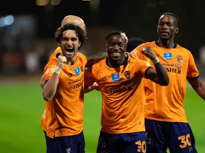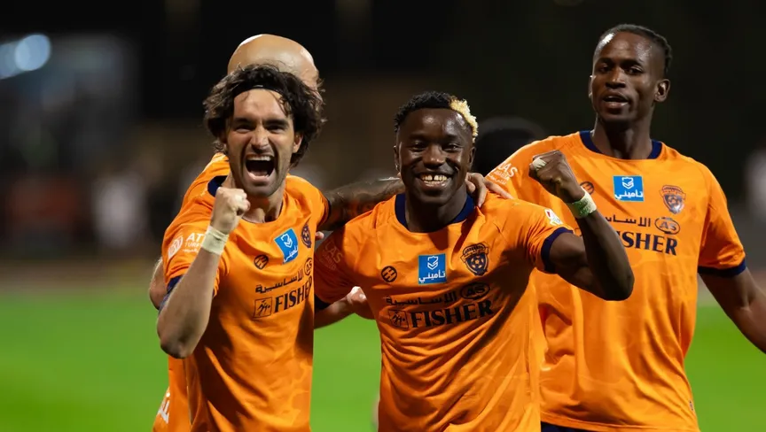 احتفال لاعبي الفيحاء بتسجيل هدف في مرمى الأهلي بالدوري السعودي - 8 أبريل 2026 - X/@AlfayhaSC