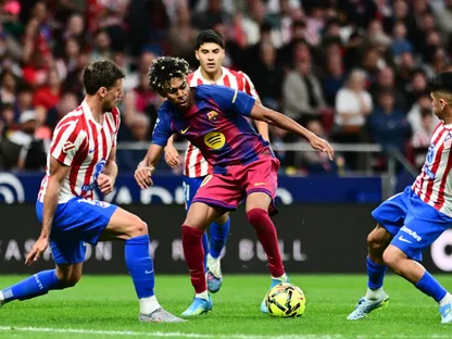 لامين يامال لاعب برشلونة يحاول مراوغة لاعبي أتلتيكو مدريد خلال مواجهة الفريقين في الدوري الإسباني - 4 أبريل 2026 - Reuters