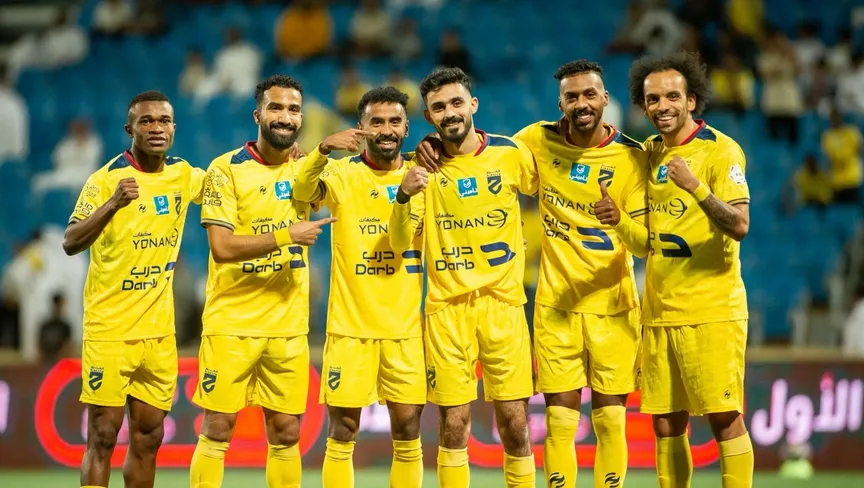 احتفال لاعبي الحزم بتسجيل هدف في مرمى الفيحاء بالدوري السعودي - 11 أبريل 2026 - X/@alhazem_fc