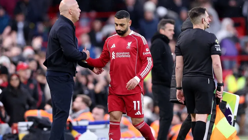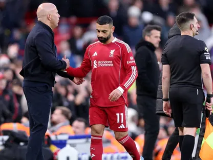 محمد صلاح يصافح آرني سلوت مدرب ليفربول بعد خروجه أمام فولهام في الدوري الإنجليزي - 11 أبريل 2026 - Reuters