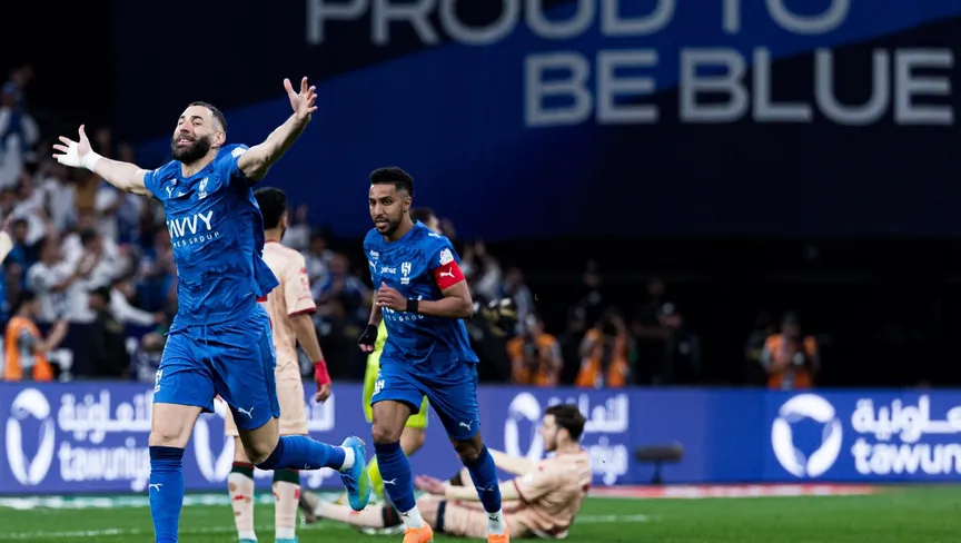 احتفال كريم بنزيما نجم الهلال بتسجيل هدف في مرمى الخلود بالدوري السعودي - 8 أبريل 2026 - X/@Alhilal_FC