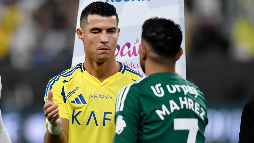 رياض محرز لاعب الأهلي يصافح كريستيانو رونالدو نجم النصر قبل مواجهة الفريقين بدوري روشن السعودي - 13 سبتمبر 2024 - Reuters