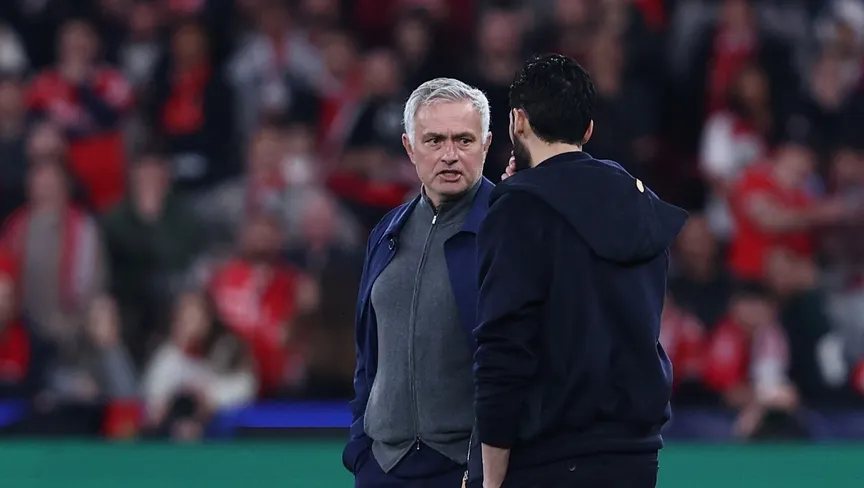 جوزيه مورينيو مدرب بنفيكا في حديث مع مدرب ريال مدريد ألفارو أربيلوا بعد واقعة فينيسيوس وبريستياني في ذهاب ملحق ثمن نهائي أبطال أوروبا - 19 فبراير 2026 - Reuters