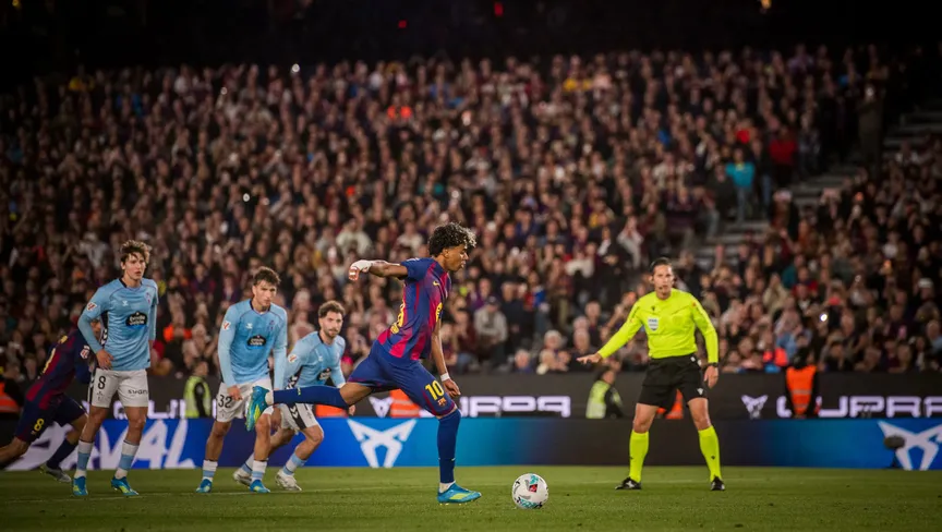 لامين يامال يسدد ركلة جزاء لبرشلونة أمام سيلتا فيغو - 22 أبريل 2026 - fcbarcelona.es