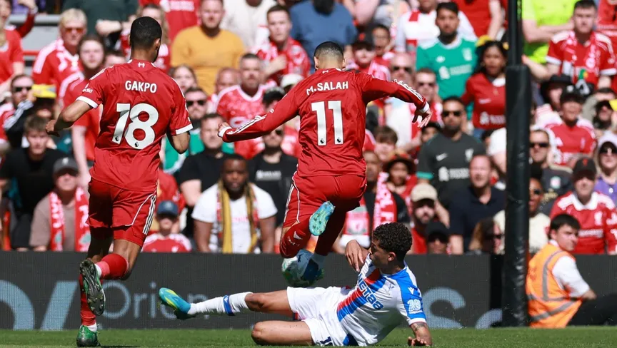 وسقط صلاح داخل منطقة الجزاء بعد هجمة مرتدة، لكن اتضح من الإعادة أن لاعب بالاس لمس الكرة أولاً قبل سقوط "الملك المصري".