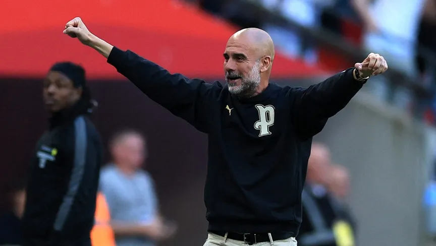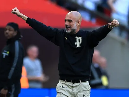 بيب غوارديولا يحتفل بهدف نيكو غونزاليس خلال لقاء مانشستر سيتي وساوثهامبتون بنصف نهائي كأس الاتحاد الإنجليزي - 25 أبريل 2026 - Reuters