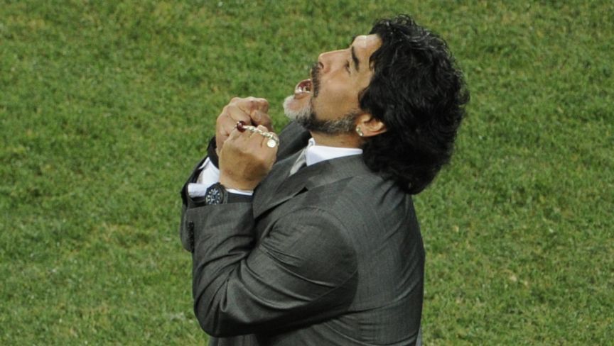 بعد معاناة مريرة في مشوار تصفيات كأس العالم 2010، حقق مارادونا "المدرب" التأهل رفقة المنتخب الأرجنتيني بصعوبة بالغة، ليَعبر إلى نهائيات مونديال القارة السمراء بجنوب إفريقيا.. ولكنه خرج خاوي الوفاض برباعية تاريخية في ربع النهائي أمام ألمانيا، ليغادر حينها تدريب منتخب "التانغو" من الباب الخلفي.