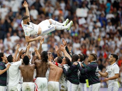 وحرص لاعبو ريال مدريد على رفع زملائهم في الهواء، بعد المباراة التي تُعدّ الأخيرة للرباعي كريم بنزيما وإيدن هازارد وماركو أسينسيو وماريانو دياز.