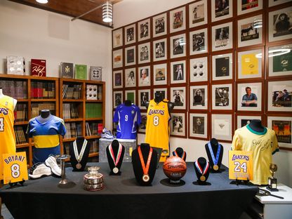 بعض مقتنيات أسطورة كرة السلة الراحل كوبي براينت في دار جوليان للمزادات  - AFP