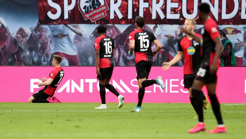 وتلقى لايبزيغ ضربة موجعة بعد طرد مدافعه هالستنبرغ لحصوله على الإنذار الثاني في الدقيقة 63، ولكن ذلك لم يمنعه من التقدم للمرة الأولى في المباراة وتحديداً بعد 5 دقائق عبر التشيكي باتريك شيك الذي سدّد كرة زاحفة بيسراه من خارج المنطقة فشل الحارس روني يارشتاين في التصدي لها بنجاح، بعدما أفلتت منه وتابعت طريقها نحو الشباك.