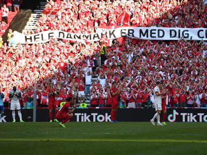 توقفت مباراة الدنمارك وبلجيكا في المجموعة الثانية لبطولة أوروبا لكرة القدم "يورو 2020"، لمدة دقيقة تكريماً لكريستيان إريكسن لاعب وسط الدنمارك الذي تعرض لأزمة قلبية في مباراتها الافتتاحية أمام فنلندا في ملعب باركن.