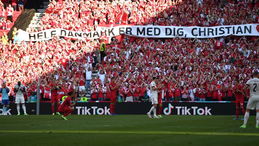 وفي الدقيقة العاشرة من المباراة (وهو نفس رقم قميص إريكسن) أوقف دريس ميرتنز لاعب بلجيكا اللعب ليبدأ اللاعبون في التصفيق بينما كشفت الجماهير الدنماركية عن لافتة كتب عليها "كل الدنمارك معك يا كريستيان".