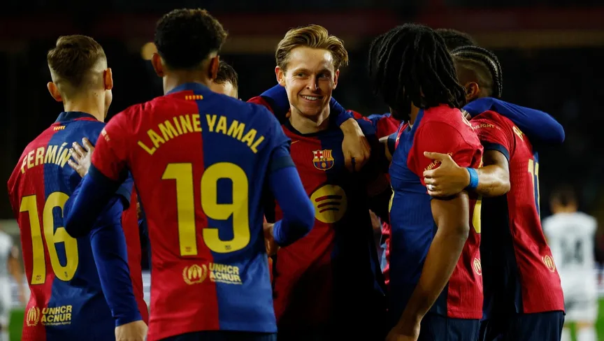 فرينكي دي يونغ لاعب برشلونة يحتفل مع زملائه بالتسجيل أمام فالنسيا في الدوري الإسباني - 26 يناير 2025 - Reuters