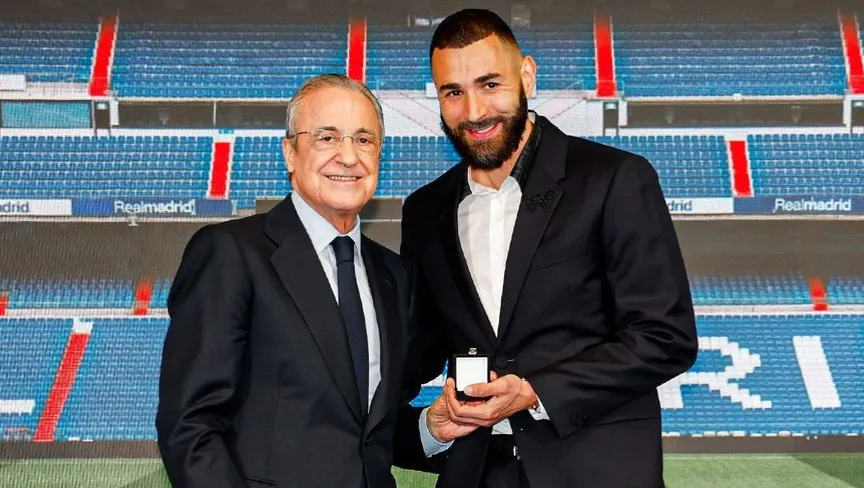 كريم بنزيما ورئيس ريال مدريد فلورنتينو بيريز - X/@realmadriden