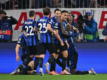 لاعبو إنتر يحتفلون بهدف لاوتارو مارتينيز في مرمى بايرن ميونيخ - 8 أبريل 2025 - Reuters