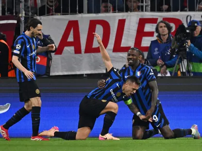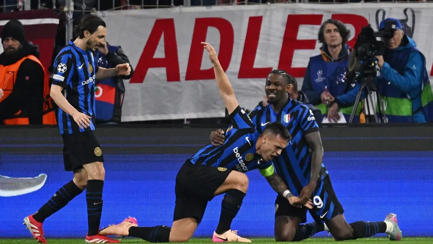 لاوتارو مارتينيز مهاجم إنتر ميلان يحتفل بهدفه أمام بايرن ميونيخ مع ماركوس تورام في ذهاب ربع نهائي دوري أبطال أوروبا - 8 أبريل 2025 - Reuters