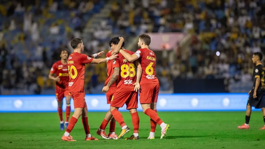 لاعبون من القادسية يحتفلون بتسجيل هدف في مرمى الوحدة بدوري روشن السعودي - 15 مايو 2025 - X/@aawsat_spt