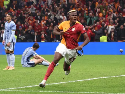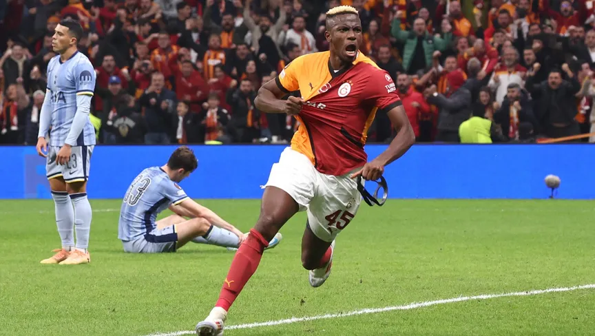 فيكتور أوسيمين يحتفل بتسجيله هدفاً لغلطة سراي في مرمى توتنهام هوتسبير بالدوري الأوروبي - 7 نوفمبر 2024 - Reuters