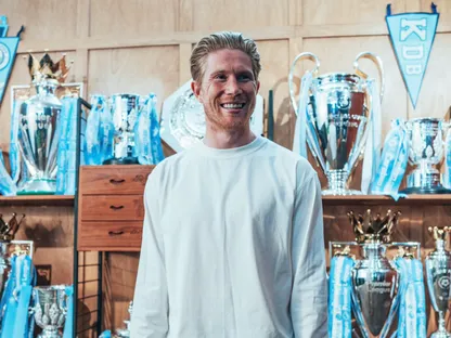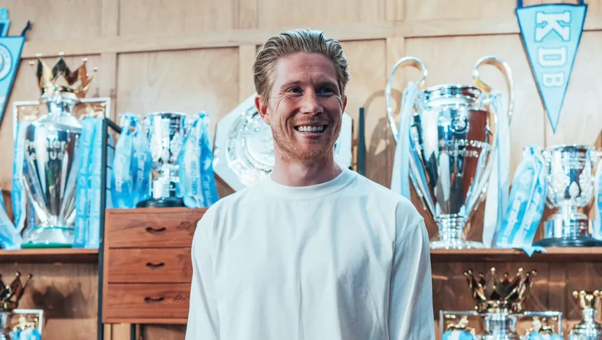 كيفين دي بروين وسط ألقابه التي تُوج بها مع مانشستر سيتي الإنجليزي - 28 مايو 2025 - X/ManCity