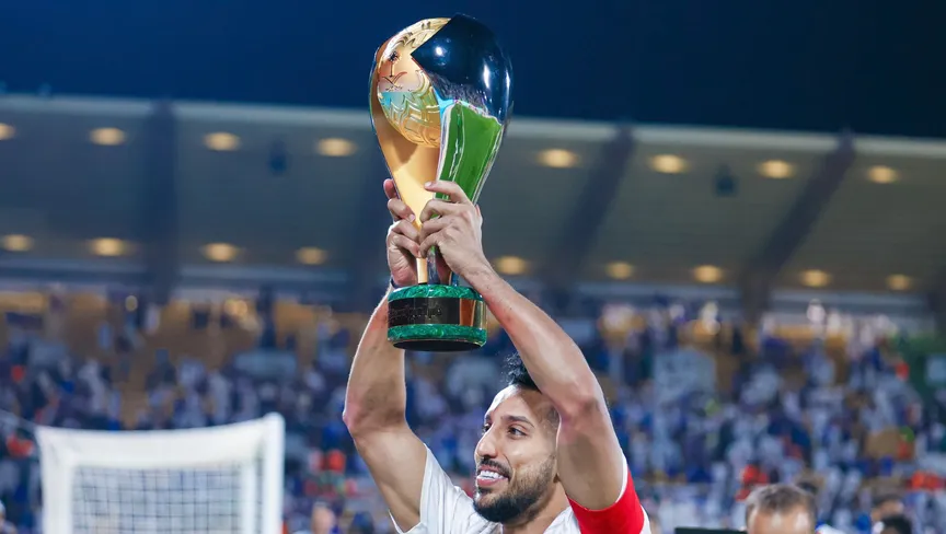 سالم الدوسري قائد الهلال يحمل كأس السوبر السعودي بعد التتويج باللقب - 17 أغسطس 2024 - X/@SaudiSuperCup