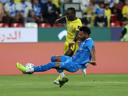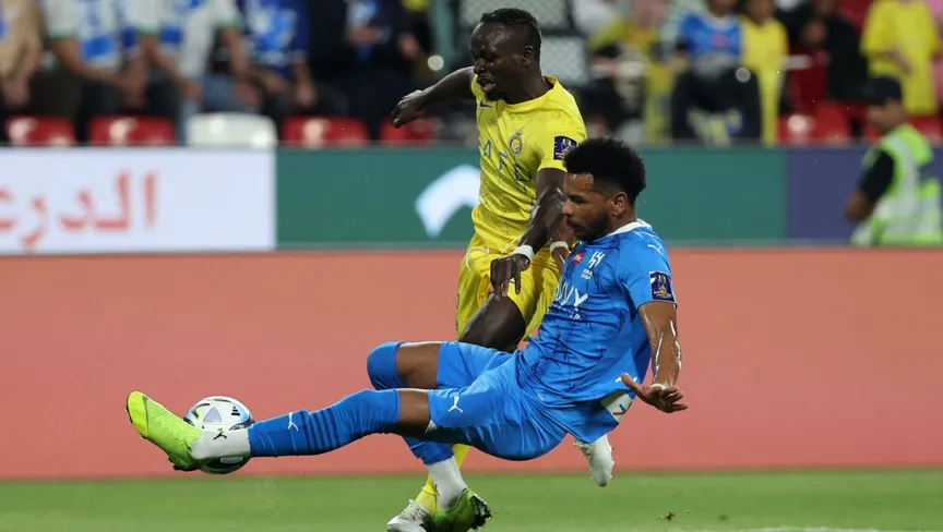 علي البليهي مدافع الهلال يتدخل بقوة أمام ساديو ماني لاعب النصر في ديربي الرياض بدوري روشن السعودي - 8 أبريل 2024 - Reuters